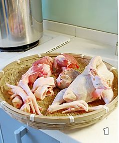 将母鸡、猪大骨、猪瘦肉、鸡爪、猪肉皮、火腿分别洗净,一起倒入大汤锅中煮熟