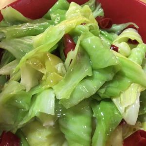 锅中油烧沸,将洗净的辣椒段倒入稍炸(注意不要将辣椒段烧糊),把撕好的包菜倒入锅中翻炒至熟透加入食盐和蒸鱼豉油(不喜欢带甜味的蒸鱼豉油不加也可以)