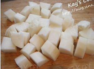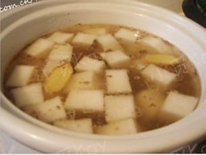 第二天早上出门前,捞去汤中血沫;将萝卜切成块,扔到汤里继续煲。
