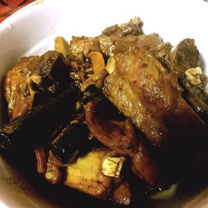 第三步~倒入排骨,放佐料~桂皮八角葱姜蒜,酱油、半碗黄酒,最后倒入开水淹没排骨为准,小火煮,剩下三分之一水放盐即可出锅