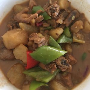 鸡肉土豆基本熟透,此时放青椒,洋葱翻炒后炖2分钟,撒葱花,出锅。