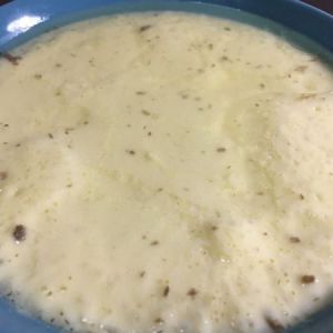 排骨汤昨天炖好,盛出一碗上面的肥汤,炖的时候已加适量盐调味。