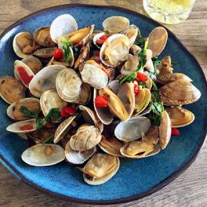 大火起油锅,爆香蒜蓉、姜丝、剁椒,下花蛤,翻炒,撒白胡椒,倒入蚝油