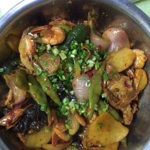 郫县豆瓣酱煸香,蒜,姜,再下入食材,黑木耳,刀豆我是先焯水的➕了盐,放水量盐,调味,放些糖。