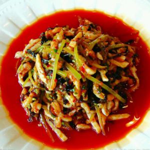 将猪脊肉切成7㎝长,0.5㎝的细丝。冬笋,水发木耳切成丝,并下入沸水中汆熟。