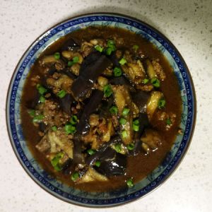 第三步倒入少许油,将已经蒸熟的茄子切断倒入,随后倒入已经调好的酱料。