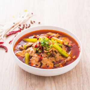 在锅中放入清水,大火烧开,将腌好的肉片散拨入锅中,将煮熟的肉片连汤汁一起盛入已放莴笋的碗中。