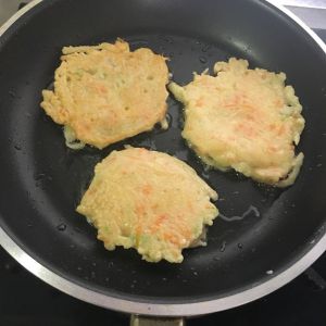 锅里放橄榄油,将搅拌均匀的面用勺子放入锅中,一面煎好了番面,直到两面煎到金黄色