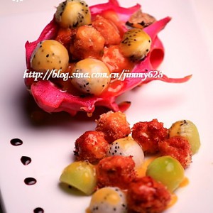 取净锅,将一份苹果醋、三份橙汁混合,再加入少许的生粉与吉士粉,拌匀成米汤芡,倒入鸡球,使其沾裹上味汁最后放入水果球,即可起锅装盘。