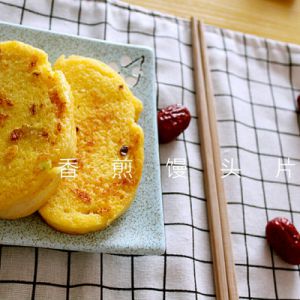 不沾锅中刷一层油,七八分热后,馒头片裹上蛋液,放入锅中煎。