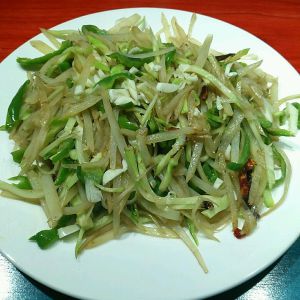 放入土豆丝,翻炒至无淀粉色,轻微透亮。