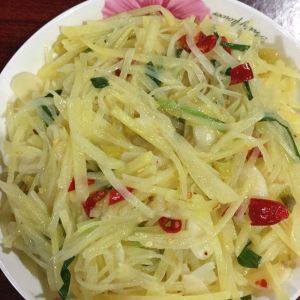 锅里倒油,然后土豆丝放进去翻炒30秒。