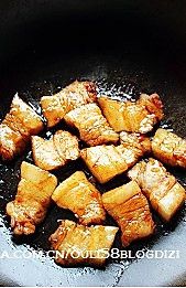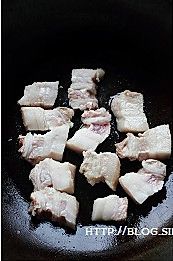铁锅里放一点点油,很少的油即可,放入五花肉小火慢慢煸炒,可以看到锅里的油多了一点,这就是五花肉本身的油脂溶了出来,这样做可以减少油腻感,等油靠出许多后,倒出来(这油炒菜老香了)