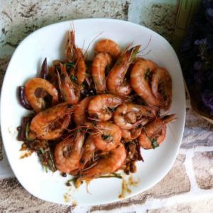 倒入虾,料酒,少量盐糖,香菜,翻遍1分钟。