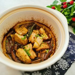 准备砂锅,底部垫茄子,上面鱼块,倒入调味料后加点水,煮熟即可