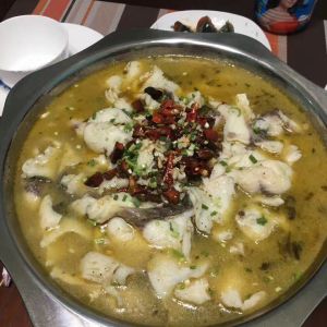 鱼块下锅前加少许淀粉拌匀,炒锅放油烧热,下鱼块翻炒一下,使鱼块定型,有条件的过一下油锅炸一下,鱼块炒完倒出,加油炒姜片,酸菜,加三斤左右的开水,下鱼块,大火将汤煮白,佐料里面还有一包调味包加到汤里,大概煮三分钟捞出鱼块、酸菜放火锅盆内打底