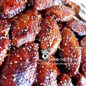 翅中涂叉烧酱、蜂蜜、生抽、老抽、黑胡椒,最后淋一些桂花酒,淹1小时