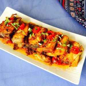 热锅放油烧六成熟,摊上鱼块煎起皮。