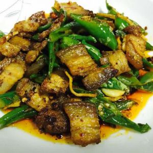再加尖椒,少许盐炒至尖椒起皮即可,出锅时候加适量白糖