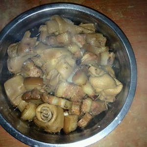 锅中放油,油六成热时,放入五花肉炸,肉皮朝下,炸至金黄时捞出,切麻将大小的块,