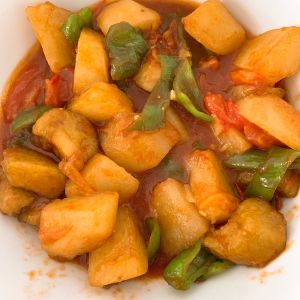 将多余的油倒出,将葱蒜番茄翻炒,再倒入已过油的辣椒,然后倒入调好的酱汁,冒泡时,倒入土豆茄子,翻炒一阵,大火收汁