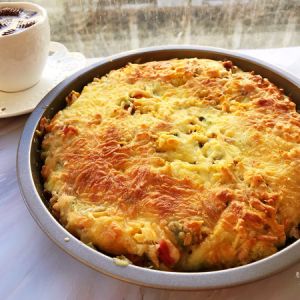 披萨盘入烤箱上层180度20分钟,220度5分钟,上色。或者看到饼鼓起来了,就是鸡蛋膨胀了,就可以调温度上色了。