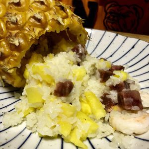 把糯米香肠丁还有菠萝肉混合在一起调味,少许盐味精和胡椒粉