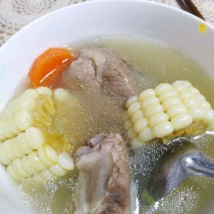排骨洗净凉水下锅 开锅捞出排骨过凉水 玉米切断 姜切片 葱切断
