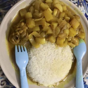 加入土豆,超市的胡萝卜有点坏了,没有买,反正我也不爱吃,但是没有土豆的咖喱鸡没有灵魂。加盐加酱油焖一下,下一步......