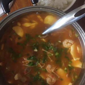 水开之后下金针菇加入韩国拌饭辣酱两勺,然后把豆腐和日本豆腐放进去,盖盖中火焖两分钟,加入牛肉卷和虾仁,然后开始调味,加少许盐少许生抽,生抽也可以不加,撒入葱花,就可以开吃啦