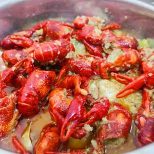 小龙虾下入蒜泥锅大火继续不断翻炒,炒大概3分钟后加入啤酒,加入半碗清水没过小龙虾。盖锅盖大火烧开后转中火煮10-15分钟就可以了!