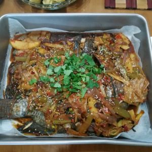 取出烤鱼,将炒好的菜连汤汁一起放到烤好的鱼上,再放入烤箱烤,200度,烤10分钟