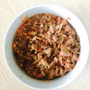 香肠取出,叉烧翻面,再烤20分钟。取出,叉烧和火腿切粒,搅拌均匀。满屋飘香。