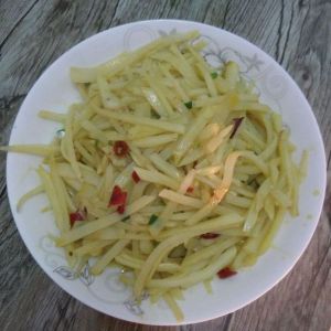 烧油,倒入小米辣,姜,蒜,葱头炒几下,倒入土豆丝翻炒