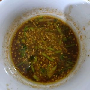 蒜泥适量,两勺生抽,两勺醋,一勺鸡精,一勺半甜面酱,一勺芝麻,一勺孜然粉。少许盐。