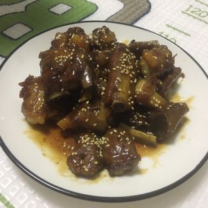 热锅温油,中火,倒入排骨翻炒至表面略微金黄,倒入酱汁继续翻炒,放入一颗八角,翻炒至冰糖完全融化、酱汁剩一点点的时候,倒入开水沫过排骨,水开后转文火炖45分钟左右。