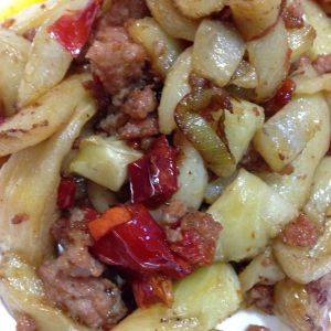 锅内放入底油,油热后葱花 花椒呛锅,煸出香味后,放入剁椒,炒香并炒出红油,然后放入肉末,炒散,放入炸好的茄条,翻炒均匀,在放入适量的盐和鸡精,就可以出锅了,出锅时散上适量香菜末,味道更棒哦