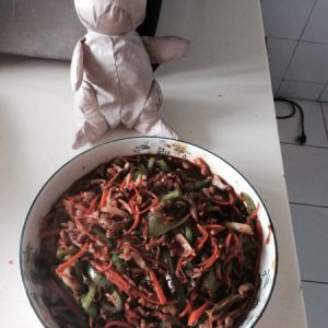 锅内加油100克置于旺火烧熟后将调料下锅微火炒香