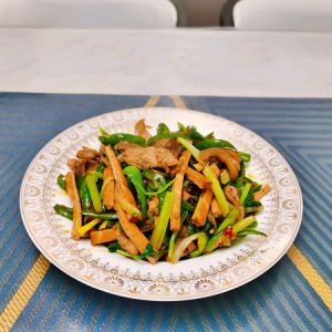 把青辣椒先倒入翻炒,断生后,倒入芹菜和香干,继续翻炒。准备起锅前,加入适量生抽、盐、鸡精、以及一点点花椒油。