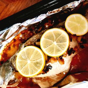再把柠檬片盖在鱼身上,放入烤箱180℃,半小时