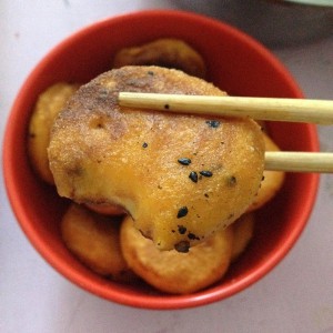 南瓜蒸熟捣碎掺糯米粉揉成面团