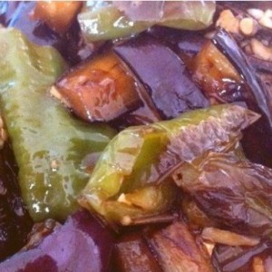 倒入青椒和茄条略微翻炒,倒入酱汁。