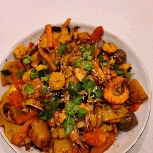 干净的锅里倒多一点油,下葱姜蒜炒香,再加入干辣椒炒香,再加入一包麻辣香锅调料炒香(用火锅底料也可以)。倒入所有煮熟的食材翻炒,炒的差不多的时候加入泡软的方便面再炒一下就可以出锅了