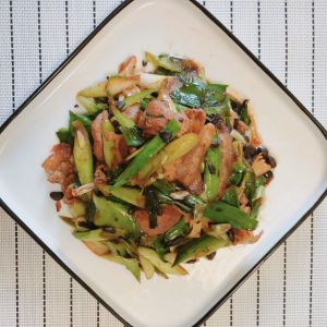 加入青蒜的白色部分煸炒,淋入生抽,蚝油,糖,翻炒一会
