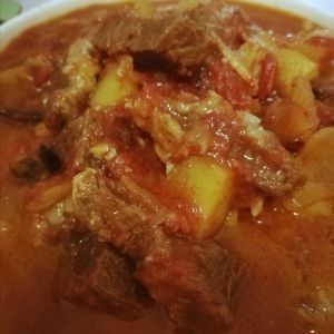 另起锅,少油,油热后放入西红柿丁,炒出水分再放入葱头和土豆炖烂,炖成这样状态就好了