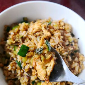 热锅冷油,油热放葱花炸至金黄,倒入鸡蛋炒熟,我喜欢焦一点的。倒入火腿丁 黄瓜丁 胡萝卜丁,翻炒几下淋入少于生抽,快速翻炒均匀,倒入米饭翻炒均匀,出锅前淋入酱油拌匀,再炒几十秒即可出锅。生抽酱油都是咸的,所以我没放盐