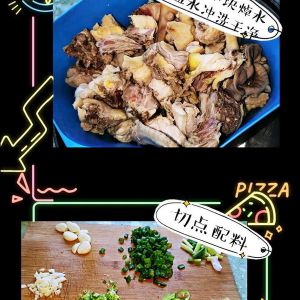 把土鸡剁成小块,凉水放入锅中焯水,加入生姜,料酒去腥。