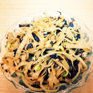 翻炒好的豆芽木耳下鸡蛋煎、鸡蛋成行下面条盐酱鸡粉翻炒一会就可以起过。不要抄太久、太久容易碎。