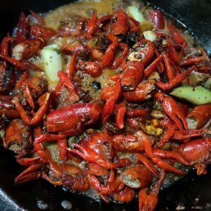 锅留底油 姜切片 独蒜横竖对半切成小坨坨 大葱切段 这里用了半根 放入锅里爆香 下酱料包 倒入过好油的下龙虾 炒其均匀
