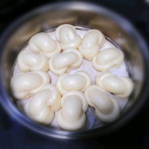 两个小时候后,加小苏打粉(用两滴水)再搓揉15分钟排气(看看有没有小孔,面粉中间切开就能看到,如果有小孔,排气还没成功,再揉)。分成小等份,摆造型(元宝)再发酵20分钟。